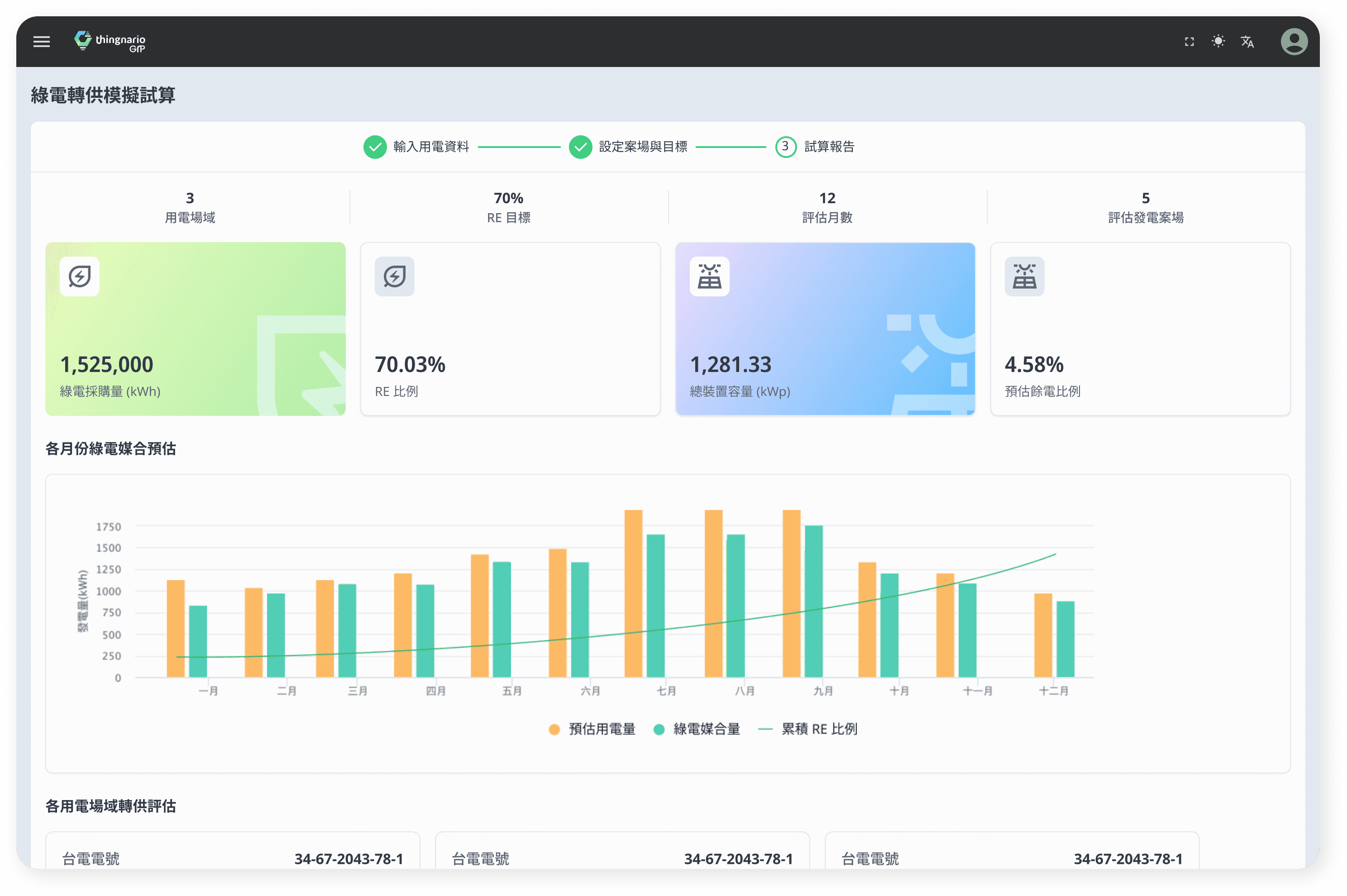快速產出包含「採購成本效益」、「減碳表現」與「預估餘電比例」的專業報告。讓複雜的轉供策略轉化為清晰的數據圖表,大幅縮短成交週期。